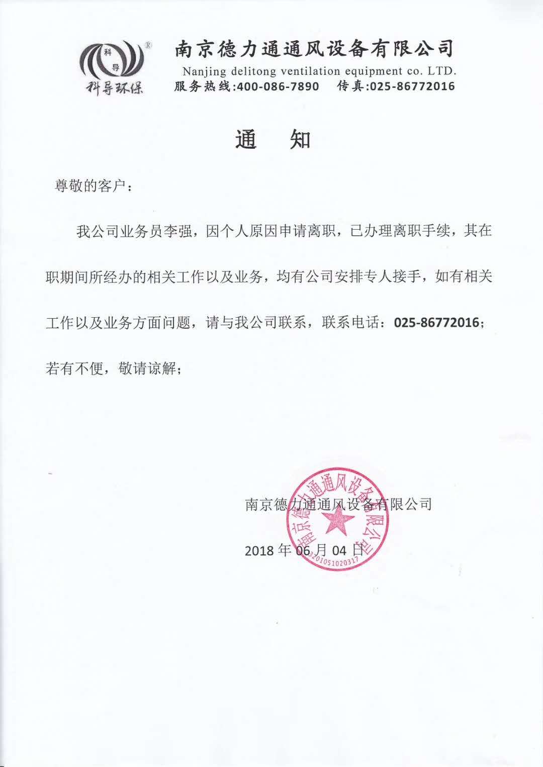 尊敬的各位領(lǐng)導(dǎo)、客戶和朋友們,餐飲油煙凈化器廠家德力通業(yè)務(wù)人員李強(qiáng),因個(gè)人原因申請(qǐng)離職,目前已辦理了離職手續(xù),其在職期間辦理的各項(xiàng)業(yè)務(wù)和工作,均有公司安排專職人員對(duì)接,如有相關(guān)工作和業(yè)務(wù)上的聯(lián)系,請(qǐng)與我司聯(lián)系,聯(lián)系電話:025-86772016,若有不便,敬請(qǐng)諒解!
